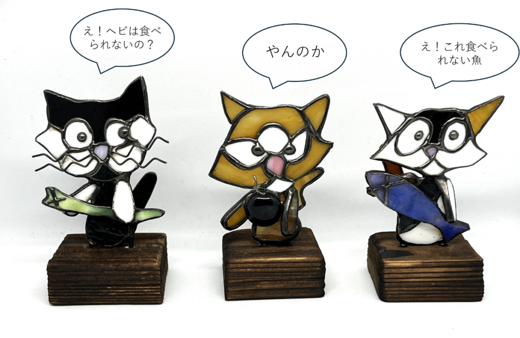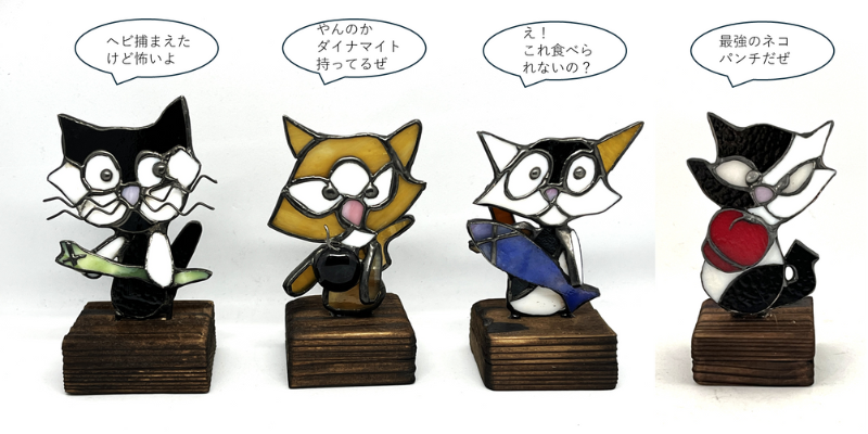 裏面から見るとちゃんとしっぽがついています。左から2つ目の猫が持っているのはダイナマイトで、ワイヤをガラスで挟んで溶かして製作しました。